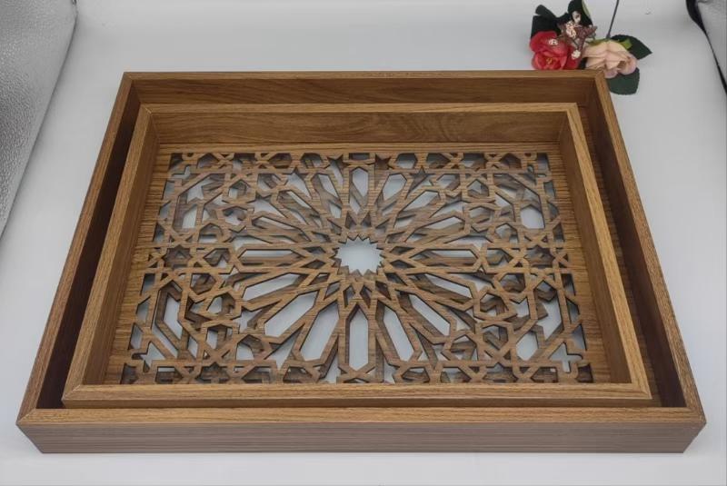 طقم صواني تقديم أنيق بتصميم مستوحى من الفن الإسلامي التقليدي، مصنوع من الخشب الطبيعي الفاخر وبنقوش هندسية دقيقة تضيف لمسة فنية راقية لمائدتك أو ديكور منزلك.